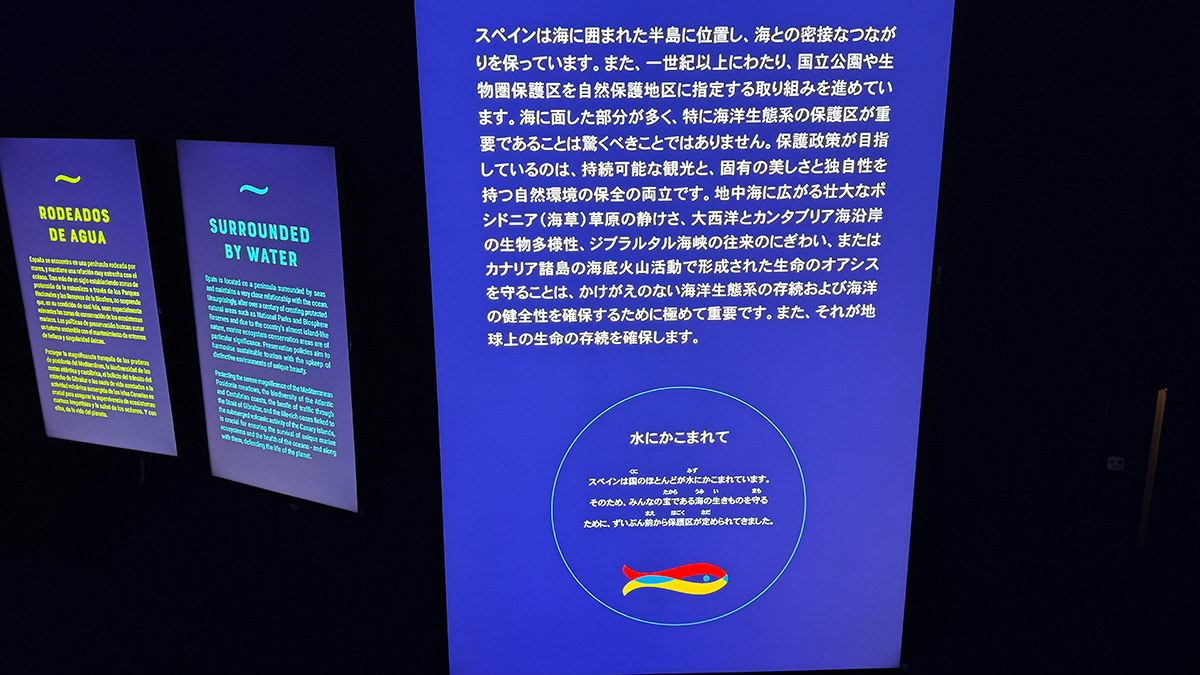 内部は高い天井から吊り下げられた青く長いカーテンが揺らめき海を表現していた。