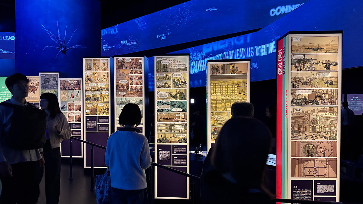 パブリオンの入口までは白い砂浜を、内部は海の中を表現していた。