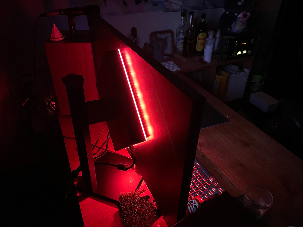 肝心の発光ユニットは基本7色(赤・黄・緑・黄緑・青・紫・白)の他にRGBを調整できるようだった。そこでキーボードの発光色とあわせたのだが、ここだけは多いに不満だった。上下で数値設定できるが数値を0→255に上げたり・下げたりがすんごい遅い。長押しで加速しないのはマジで設計ミスだと思う。USBハブで接続するとPC連動で設定できるらしいので、そちらでやったほうがいいかもしれない。しかし色は一度設定してしまえば再設定もすることはないだろう。見た目は最高で大いに満足。