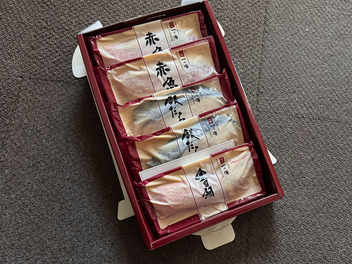 公式サイトの通販を覗いてみると、西京焼き5品セット(銀鱈×2、赤魚×2、金目鯛)が¥3,800。送料いれてもランチ一食以下と思えば全然アリだ!とあまり悩まず注文した。