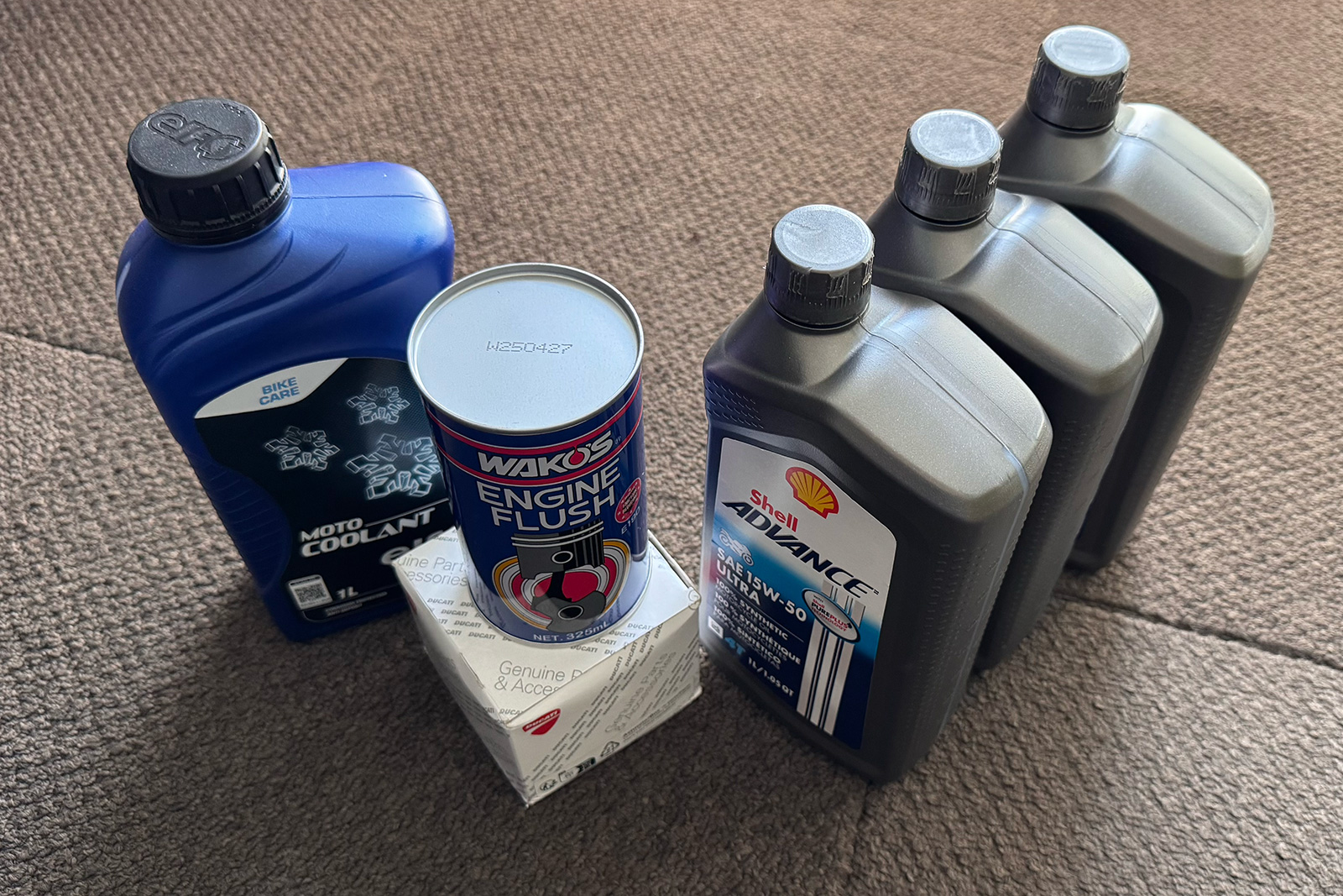 クーラントはDucati純正はENI antifreezerという商品だが、国内で取扱いがない。そして個人輸入すると割と高い。流石にそこまで純正にこだわる必要もないと思い、ボクはelfが大好きなのでレーシングではないオーガニッククーラントにした。(購入した時はケース損傷とかでアウトレット品があって合計2,000円ほどだった) この辺は好みなので安定のWAKO’Sでも良いと思う。(値段が誤差だった)必要量は1.1Lなのでelf MOTO COOLANT ORGANICでは微妙に足りないので2つ必要。