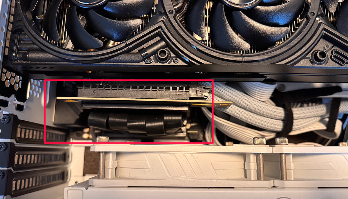 あまりこの手の投稿が残っていないようなので備忘録を残すと、購入したGLOTRENDSのライザーケーブルは割と柔軟に折れ曲がってくれたので良い感じに接続することができた。ケーブルをS字に折り曲げ、2本のタイバンドで結束することでファンに接触しないように接続することができた。決め打ちで短い物を買うのが間違いはないけれど、柔軟にマザーボードとグラフィックカードを接続できるので、長いケーブルを折り曲げて接続もアリだと感じた。