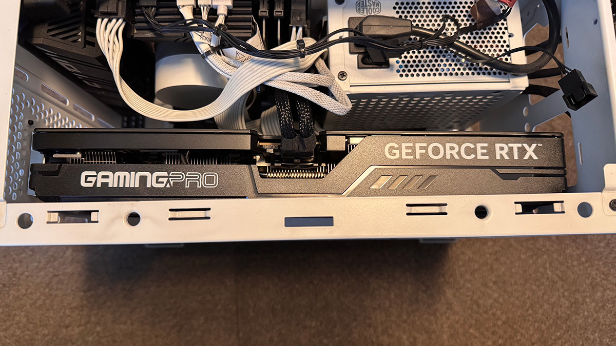 とはいえどグラフィックカード下はCPU水冷クーラーの冷却ファンがあるため、やや接触が怖いのためファンガードをつけて対応しよう。